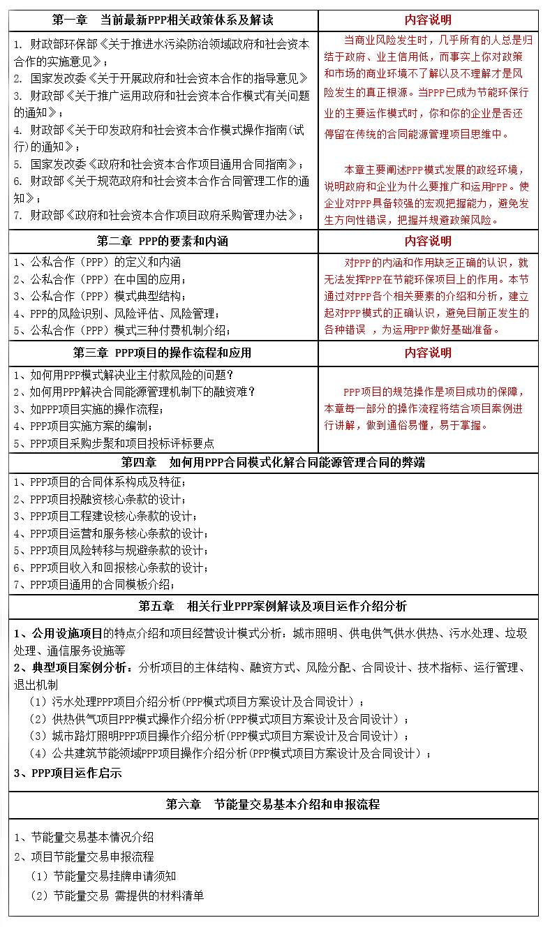 對政府和社會資本(PPP)合作開展的低碳環(huán)保類項目,如何編制實施方案,從項目可行性、財政負(fù)擔(dān)能力、公眾意愿和接受程度等方面進(jìn)行科學(xué)評估和充分論證,是擺在廣大從業(yè)者和施政者面前的實際課題。為響應(yīng)財政部《關(guān)于推廣運用政府和社會資本合作模式有關(guān)問題的通知》關(guān)于“持續(xù)開展PPP實施能力建設(shè)”的要求,進(jìn)一步落實PPP的實施工作,加強PPP項目實施水平,“中國能源研究會節(jié)能與能源管理專業(yè)委員會”將于2015年6月12-14日在北京舉辦“節(jié)能低碳環(huán)保項目PPP模式應(yīng)用”能力建設(shè)培訓(xùn)班。