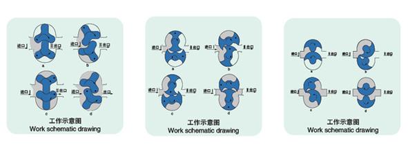 工作原理:轉(zhuǎn)子泵又稱膠體泵,三葉泵,鞋底泵等。依靠兩同步反向轉(zhuǎn)動的轉(zhuǎn)子(齒數(shù)為2—4)在旋轉(zhuǎn)過程中于進口處產(chǎn)生吸力(真空度),從而吸入所要輸送的物料。兩轉(zhuǎn)子將轉(zhuǎn)子室分隔成幾個小空間,并按a→b→c→d的次序運轉(zhuǎn)。運轉(zhuǎn)至位置a時,只有Ⅰ室中充滿介質(zhì);到位置b時,B室中封閉了部分介質(zhì);到位置C時,A室中也封閉了介質(zhì);到位置d時,A室B室與Ⅱ室相通,介質(zhì)即被輸送至出料口。如此循環(huán)往復(fù),介質(zhì)(物料)即被源源不斷地輸送出。