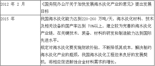 規(guī)定對(duì)海水淡化要實(shí)施財(cái)政補(bǔ)貼,不斷降低其成本,解決制約海水淡化產(chǎn)業(yè)的瓶頸。我國(guó)海水淡化工程迎來良好的發(fā)展契機(jī),將相應(yīng)促進(jìn)耐蝕合金材料需求的增長(zhǎng)。