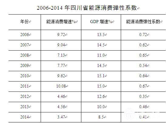 從上表可以看出,近年來,四川能源消費增長速度一直較國民經(jīng)濟增長速度低,能源消費彈性系數(shù)趨小,經(jīng)濟增長對能源的依賴程度有所降低,經(jīng)濟發(fā)展方式在發(fā)生轉(zhuǎn)變。特別是2012年和2014年,能源消費彈性系數(shù)分別為0.35和0.41,與2006年和2010年相比逐步趨小,說明經(jīng)濟增長由高耗能發(fā)展向低耗能方向轉(zhuǎn)變,呈現(xiàn)了經(jīng)濟較快增長,能源消費適度增長的良好局面。