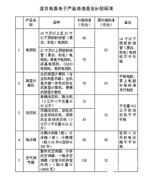 新版補貼標準對廢棄電視機、微型計算機、洗衣機、電冰箱、空氣調(diào)節(jié)器產(chǎn)品的處理基金補貼標準進行了調(diào)整,其中,對廢棄電視機和微型計算機的基金補貼標準略有下調(diào),而對廢棄空調(diào)器的補貼標準則有較大幅度提高,從35元/臺提高至130元/臺。