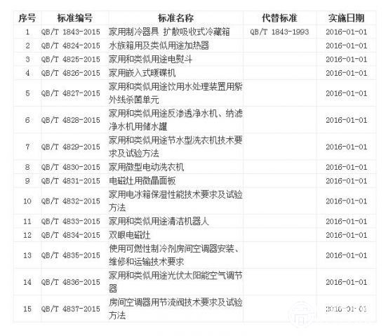 自元旦起,由工信部發(fā)布的15項涉及家電領(lǐng)域的行業(yè)標準開始實施,這15項行業(yè)標準分別是:QB/T 1843-2015《家用制冷器具 擴散吸收式冷藏箱》、QB/T 4824-2015《水族箱用及類似用途加熱器》、QB/T 4825-2015《家用和類似用途電熨斗》、QB/T 4826-2015《家用嵌入式暖碟機》、QB/T 4827-2015《家用和類似用途飲用水處理裝置用紫外線殺菌單元》、QB/T 4828-2015《家用和類似用途反滲透凈水機、納濾凈水機用儲水罐》、QB/T 4829-2015《家用和類似用途節(jié)水型洗衣機技術(shù)要求及試驗方法》、QB/T 4830-2015《家用微型電動洗衣機》、QB/T 4831-2015《電磁灶用微晶面板》、QB/T 4832-2015《家用電冰箱保濕性能技術(shù)要求及試驗方法》、QB/T 4833-2015《家用和類似用途清潔機器人》、QB/T 4834-2015《雙眼電磁灶》、QB/T 4835-2015《使用可燃性制冷劑房間空調(diào)器安裝、維修和運輸技術(shù)要求》、QB/T 4836-2015《家用和類似用途光伏太陽能空氣調(diào)節(jié)器》、QB/T 4837-2015《房間空調(diào)器用節(jié)流閥技術(shù)要求及試驗方法》。