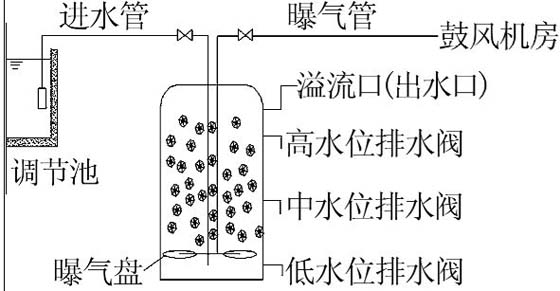 SMBBR工藝是基于移動(dòng)床生物膜法(MBBR)的一種改進(jìn)技術(shù),其兼具傳統(tǒng)流化床和生物接觸氧化法兩者的優(yōu)點(diǎn),選用特殊的SDC-03型生物載體作為填料,選用特定的具有很強(qiáng)的生命力和旺盛的繁殖能力,能適應(yīng)各種不良的環(huán)境條件的高活性反硝化菌DNF409作為菌種,組合成SMBBR工藝。SMBBR通過曝氣和水流的提升作用使填料處于流化狀態(tài),提高廢水與懸浮填料的接觸次數(shù),延長反應(yīng)時(shí)間且動(dòng)力消耗極低。SMBBR工藝流程:綜合廢水→調(diào)節(jié)池→一級(jí)水解酸化池→單一SMBBR池→二級(jí)水解酸化池→接觸氧化池→二沉池→排水。SMBBR工藝裝置見圖1。