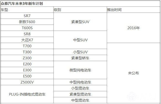 按照眾泰汽車規(guī)劃,未來(lái)三年將推出至少15款車型,包括緊湊型SUV 2016款T600、緊湊型SUV T600S、中型SUV T700、小型SUV T300、緊湊型SUV SR7、緊湊型轎車Z300、中型SUV SR8、中型SUV 大邁X7。新能源方面,眾泰將推出三款微型純電動(dòng)車,分別為E200、E300、E500;一款中型純電動(dòng)車Z500EV以及A0級(jí)、A級(jí)、B級(jí)三款PLUG-IN插電式混合動(dòng)力乘用車。