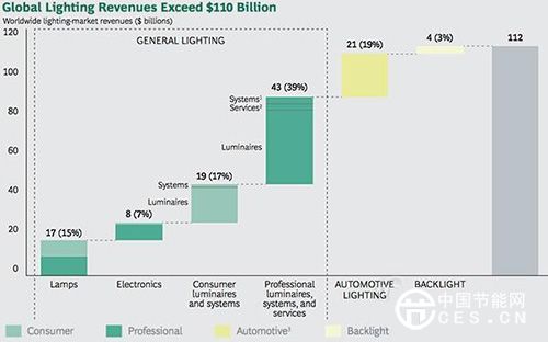2014年全球照明市場營收為1120多億美元,未來幾年內(nèi)預(yù)計(jì)將繼續(xù)保持穩(wěn)定增長勢頭。其中最大的領(lǐng)域是專業(yè)照明市場,專業(yè)照明燈具、相關(guān)服務(wù)和系統(tǒng)營收達(dá)430億美元,搶占39%的市場份額;汽車照明市場營收為210億美元,搶占19%的市場份額;消費(fèi)燈具和系統(tǒng)營收為190億美元,搶占17%的市場份額。