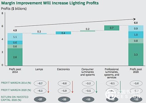 據(jù)波士頓咨詢公司(BCG)報(bào)告顯示,隨著LED燈開始大肆削減傳統(tǒng)燈具銷量,全球照明市場正發(fā)生翻天覆地的變化。2010-2014年全球照明市場增長3%,營收為1120億美元,預(yù)計(jì)到2020年將增至1330億美元。此外,LED市場份額將從2014年的5%增至2020年的45%,全球照明市場利潤將保持相對(duì)穩(wěn)定,從當(dāng)前的49億美元增至2020年的60億美元。