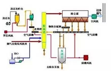 從鍋爐出來的含有粉塵和SO2的煙氣,從脫硫塔的底部經(jīng)過文丘里管上升,進(jìn)入塔內(nèi)。生石灰在消化器內(nèi)加水消化后,在消石灰倉儲(chǔ)存。將一定量的消石灰粉和水在文丘里喉口上端加入,在脫硫塔內(nèi)與煙氣混合流動(dòng),并與煙氣中的SO2反應(yīng),生成亞硫酸鈣和硫酸鈣。攜帶反應(yīng)產(chǎn)物和煤灰的煙氣冷卻到稍高于露點(diǎn)以上的溫度,進(jìn)入后面的布袋除塵器。反應(yīng)產(chǎn)物和煤灰被除塵器處理后,通過空氣斜槽返回塔內(nèi),再次循環(huán)參與脫硫反應(yīng)。在垃圾焚燒爐煙氣凈化中,在除塵器前加入活性炭末,通過多次循環(huán),以達(dá)到脫除重金屬、二噁英的效果,脫硫灰通過倉泵輸灰至灰倉外排。由于消石灰、煤灰和反應(yīng)產(chǎn)物多次在脫硫塔和除塵器之間循環(huán),增加了反應(yīng)時(shí)間,消石灰的作用得以充分發(fā)揮,用量減少,同時(shí)脫硫效率得以提高。