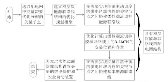 步驟3:基于上述優(yōu)化規(guī)劃模型,在需要實現(xiàn)能源主動調(diào)度的供電區(qū)域內(nèi)外的關(guān)鍵節(jié)點之間搭建柔性潮流調(diào)控能源聯(lián)絡(luò)線,并優(yōu)化計算出聯(lián)絡(luò)線上的D-FACTS的安裝位置和容量,在需要實現(xiàn)能量自然平衡的供電區(qū)域內(nèi)外的關(guān)鍵節(jié)點之間搭建基本能源聯(lián)絡(luò)線,由此形成雙層次能源聯(lián)絡(luò)線結(jié)構(gòu)。