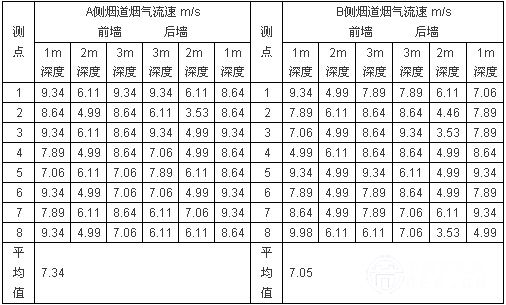 A、B側(cè)煙道煙氣流速基本均勻,A側(cè)煙道平均流速7.34m/s,B側(cè)煙道平均流速7.05m/s。沿?zé)煹缹挾确较?,A、B側(cè)煙道風(fēng)速流場(chǎng)較為均勻,基本都在7m/s左右波動(dòng)。沿?zé)煹郎疃确较?,煙道前后煙氣流速呈?duì)稱分布,在距離煙道壁面2m左右深度流速較低約為5m/s,其他深度流速在6~10m/s;