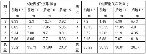 在每個(gè)測(cè)點(diǎn)等速取樣15min,分別測(cè)量飛灰取樣總量,根據(jù)飛灰取樣數(shù)據(jù)計(jì)算出每立方米煙塵濃度。試驗(yàn)數(shù)據(jù)如下: