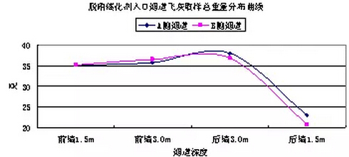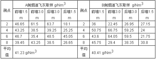 根據(jù)以上數(shù)據(jù)分析,沿?zé)煹缹挾确较?,飛灰濃度分布相對(duì)均勻,沒有明顯的規(guī)律性差異。沿?zé)煹郎疃确较?,飛灰濃度差別相對(duì)較大,距離前墻1.5m和3m深度位置與距離后墻3m深度位置飛灰濃度比較一致,均為45g/Nm3左右,距離后墻1.5m深度位置,飛灰濃度大幅降低至30 g/Nm3以下;