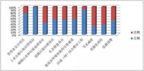 從圖1可以看出,工業(yè)點源污染治理項目的資金投入全部用于近期,遠期將不再投入資金。河道(網)綜合整治工程的項目資金接近90%為近期投入。遠期資金投入側重的項目工程包括節(jié)水減排、資源綜合化利用,且資金投入量會有所增加。