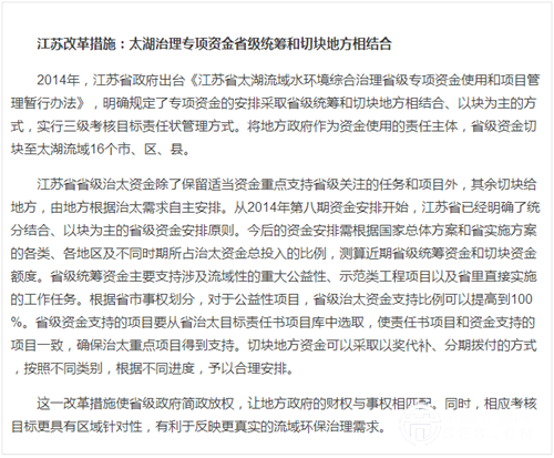 2007年9月,江蘇省政府為推動太湖流域水污染防治工作,印發(fā)了《江蘇省太湖水污染治理工作方案的通知》,明確提出省財政每年安排專項資金,支持太湖調水引流、疏浚清淤、污水處理、生態(tài)修復、監(jiān)測預警等重點工程的建設。按照政策要求,從2007年起每年安排20億財政資金支持12類重點項目。太湖地區(qū)各市、縣(市)以2007年基數,每年從新增財力中劃出10%-20%專項用于水污染防治。項目具體包括飲用水安全、產業(yè)結構調整、點源污染治理、城鎮(zhèn)污水處理和垃圾處置、面源污染治理、生態(tài)修復、資源再利用、提高水環(huán)境容量的引排通道工程、河網綜合整治、節(jié)水減排、太湖流域水環(huán)境監(jiān)測預警系統(tǒng)、科技支撐等12類。