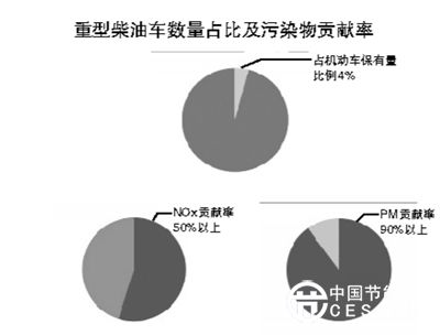 北京市有重型柴油車約23萬輛,占機動車保有量4%左右,但排放PM占機動車排放總量的90%以上; 一輛國三重型柴油車排放NOx相當于100輛左右國四小轎車排放量