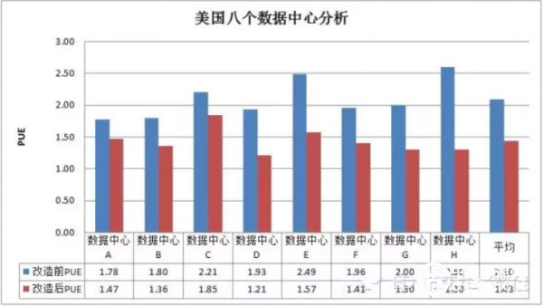 PUE 作為數(shù)據(jù)中心能耗衡量指標(biāo),是一個(gè)非常重要的概念。PUE等于數(shù)據(jù)中心總電耗除以數(shù)據(jù)中心IT電耗。如果PUE為2,這代表如果數(shù)據(jù)中心有1W的服務(wù)器,我們需要額外1W的制冷,照明及其他相關(guān)設(shè)備去支持那1W的服務(wù)器。世界最低PUE為1.08,是Facebook的數(shù)據(jù)中心。那意味著他們只用0.08W的額外電耗就可以支持1W的服務(wù)器。美國環(huán)保署公布的美國平均數(shù)據(jù)中心PUE是1.8到2.0.中國數(shù)據(jù)中心的平均PUE可能會(huì)稍高一些。小編列出了八個(gè)不同大小數(shù)據(jù)中心的當(dāng)前PUE和改造后預(yù)計(jì)PUE供大家參考。如下圖所示,美國這八個(gè)真實(shí)數(shù)據(jù)中心的平均PUE確實(shí)在2.1,和美國環(huán)保署的數(shù)據(jù)接近。通過節(jié)能改造,PUE可以降低到1.43.其實(shí)這就是數(shù)據(jù)中心的現(xiàn)實(shí),小編認(rèn)同推廣超低能耗數(shù)據(jù)中心(PUE低于1.2,微軟,谷歌,亞馬遜數(shù)據(jù)中心)的價(jià)值,但是小編并不認(rèn)為這適用于中國的絕大多數(shù)數(shù)據(jù)中心。如果把PUE做到低于1.2,需要大量的錢,二這些錢是大多數(shù)企業(yè)都很難承擔(dān)的。一個(gè)更為有有效的方式可能是使用一些低價(jià),立竿見影的手段幫助數(shù)據(jù)中心業(yè)主把PUE降低到1.5左右。如果之前PUE是2的話,這意味著25%的電費(fèi)降低,對(duì)業(yè)主會(huì)產(chǎn)生足夠的吸引力。