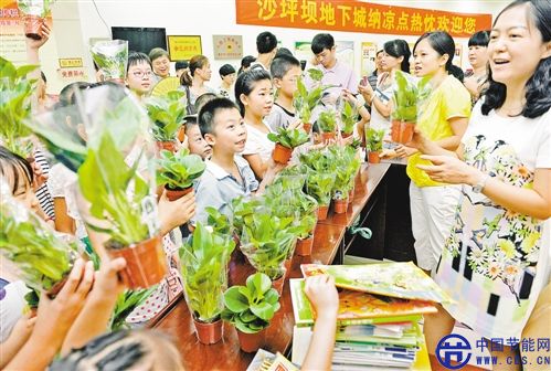 8月4日,在重慶沙坪壩區(qū)地下城納涼點(diǎn),社區(qū)居民排隊(duì)用舊書(shū)從該區(qū)婦聯(lián)工作人員手中置換綠色植物。為提倡低碳環(huán)保、節(jié)能減排,該區(qū)婦聯(lián)開(kāi)展“節(jié)能度夏 低碳納涼 全家總動(dòng)員”活動(dòng),以環(huán)保知識(shí)講座、“舊物換綠”等形式,倡導(dǎo)市民每天少開(kāi)一小時(shí)空調(diào),到所在區(qū)域的人防工程納涼點(diǎn)納涼。記者 張錦輝 攝