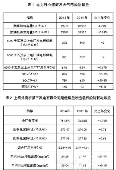 據(jù)不完全統(tǒng)計(jì),2014年全國(guó)實(shí)現(xiàn)超低排放的至少有14個(gè)電廠的19臺(tái)機(jī)組,總?cè)萘?34.5萬(wàn)千瓦,其中有3臺(tái)百萬(wàn)千瓦燃煤機(jī)組。表1顯示全國(guó)電力行業(yè)污染物排放及煤耗指標(biāo)。