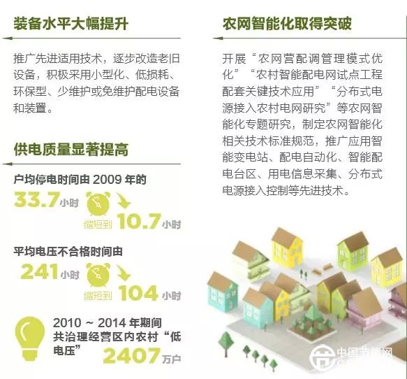 新 一輪農(nóng)村電網(wǎng)改造升級(jí)工程結(jié)束。該輪工程,國(guó)家電網(wǎng)公司累計(jì)完成國(guó)家下達(dá)的農(nóng)網(wǎng)改造升級(jí)工程投資1391億元。農(nóng)網(wǎng)供電可靠率完成99.735%,提高了 0.07個(gè)百分點(diǎn);年戶均停電時(shí)間23.21小時(shí)/戶,同比減少停電時(shí)間6.14小時(shí)/戶,城鄉(xiāng)停電時(shí)間差距進(jìn)一步縮小4.4小時(shí)/戶;農(nóng)網(wǎng)綜合電壓合格 率完成98.074%,同比提高0.386個(gè)百分點(diǎn),同比減少電壓不合格時(shí)間33.8小時(shí)。