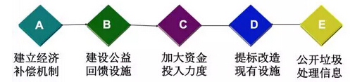 積極推進垃圾分類和減量化工作,緩解垃圾末端治理壓力及促進垃圾的資源化利用. 充分剖析垃圾源 頭減量和資源回收利用的前提條件;建立健全以市場化為主導、政府扶持的垃圾源頭減量和資源回收利用 規(guī)劃體系;對餐廚垃圾進行處理,以減輕垃圾處理壓力;完善再生資源回收利用體系,健全再生資源回收 網(wǎng)絡,加快回收站點建設,規(guī)范站點管理;大規(guī)模高標準發(fā)展垃圾,減少垃圾的填埋量;加大宣傳力度, 提高市民環(huán)保意識,鼓勵市民及社會力量參與垃圾的源頭減量。