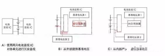 其中,A)電路為使用兩組IC對同一組電池組進(jìn)行冗余監(jiān)視;B)為從外部提供一個標(biāo)準(zhǔn)電壓源2用于確認(rèn)IC的測定精度。C)為從內(nèi)部產(chǎn)生該標(biāo)準(zhǔn)電壓源。
