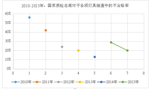 2010-2015年,國(guó)家質(zhì)檢總局對(duì)于各項(xiàng)燈具抽查中的不合格率