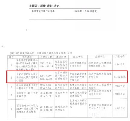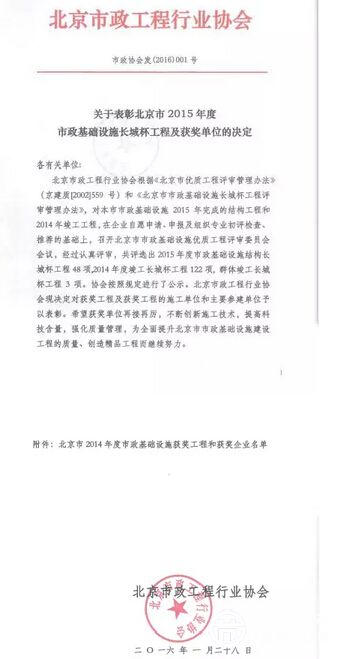 核心提示:2016年3月10日北京市政工程行業(yè)協(xié)會發(fā)布《關(guān)于表彰北京市2015年度市政基礎(chǔ)設(shè)施長城杯工程及獲獎單位的決定》(市政協(xié)會發(fā)[2016]001號)文件,正