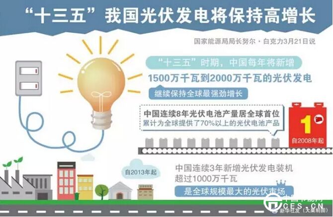近年來,在中國眾多清潔能源利用方式中,太陽能特別是光伏發(fā)電快速發(fā)展,成為全球規(guī)模最大的光伏市場,同時(shí)已形成多元化格局。在“十三五”時(shí)期,繼續(xù)保持全球最強(qiáng)勁增長的光伏市場。中國愿與各國分享太陽能產(chǎn)業(yè)發(fā)展的經(jīng)驗(yàn),加快能源基礎(chǔ)設(shè)施建設(shè)為經(jīng)濟(jì)發(fā)展和人民生活的改善提供能源保障。