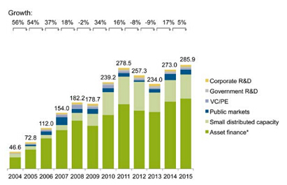 2015年可再生能源中的所有投資,包括早期階段的技術(shù)研發(fā)以及對新產(chǎn)能的投入,總計達2860億美元,比2011年創(chuàng)下的舊紀錄高出約3%。自2004年以來,全球已投入2.3萬億美元于可再生能源。