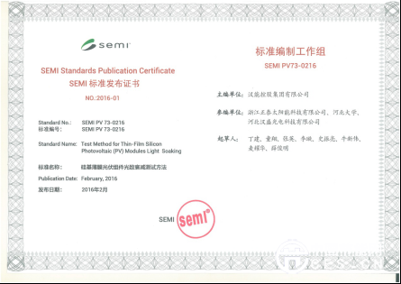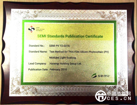 近日,由漢能控股集團有限公司(以下簡稱漢能控股)主導編制的《硅基薄膜光伏組件光致衰退測試方法》(SEMI PV 73-0216)正式發(fā)布,并獲得SEMI頒發(fā)的標準證書。與此同時,漢能控股還在主編《柔性薄膜光伏組件卷曲測試方法》SEMI國際標準、《銅銦鎵硒薄膜光伏組件》國家標準和我國建筑工業(yè)產(chǎn)品行業(yè)標準《建筑用柔性薄膜光伏組件》。其中,《銅銦鎵硒薄膜光伏組件》國家標準將是我國首個專門針對銅銦鎵硒薄膜光伏組件的國家標準。
