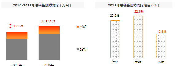 熱泵壓縮機(jī)市場(chǎng)在2015年整體規(guī)模達(dá)到151.2萬臺(tái),行業(yè)保持較快的增長(zhǎng),高于熱泵熱水器整機(jī)市場(chǎng)的增幅。其中旋轉(zhuǎn)熱泵壓縮機(jī)的增幅高于渦旋,主要是受到下游家用熱泵機(jī)發(fā)展的拉動(dòng),另外出口也貢獻(xiàn)了不少增長(zhǎng)。2015年采暖行業(yè)的需求成為熱泵壓縮機(jī)市場(chǎng)增長(zhǎng)的新興領(lǐng)域。2015年渦旋的臺(tái)套結(jié)構(gòu)比例為22%,較2014年下降2個(gè)百分點(diǎn)。