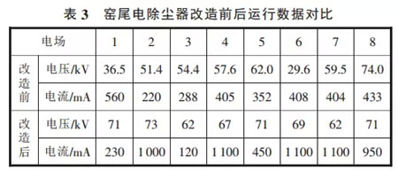 20天完成窯尾電除塵器電控系統(tǒng)升級改造并投入使用,從電除塵器實(shí)際運(yùn)行參數(shù)來看,各電場電壓均在60kV以上,電流較改造前有明顯提高,見表3。