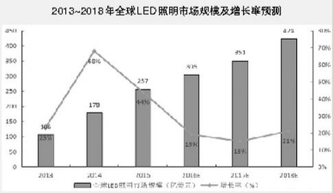 由于替代性光源和全球白熾燈替換熱潮的推動,2014年全球LED照明市場快速增長,但是2015年由于替代性光源產(chǎn)品(含燈管、球泡燈)等產(chǎn)品價(jià)格大幅下跌,產(chǎn)品利潤不如預(yù)期,使得LED照明市場增長動力不足。LED照明市場規(guī)模增長有所放緩,2015年全球LED照明市場規(guī)模為257億美元,同比2014年增長44%,LED照明市場滲透率達(dá)到31%。預(yù)計(jì)2016年到2018年全球LED照明市場增長逐漸趨于穩(wěn)定,部分替代性光源已經(jīng)更換完成,市場增長率穩(wěn)定在20%左右。照明企業(yè)開始把重心轉(zhuǎn)移到專業(yè)照明領(lǐng)域,如商業(yè)照明、工程照明和建筑照明等。
