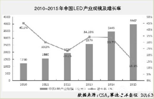 近年來,中國LED照明的市場滲透率大幅度增加,在景觀照明、道路照明、商業(yè)照明等領(lǐng)域得以推廣使用,并加速向家用照明滲透。2015年,我國半導(dǎo)體照明整體產(chǎn)業(yè)規(guī)模為3967億元,同比2014年增長15%,與過去10年超過30%的年均增長速度相比,增速明顯下降。
