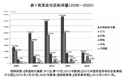 “十二五”規(guī)劃明確提出“資源節(jié)約環(huán)保成效顯著”的核心目標(biāo),進一步強化健全了節(jié)能減排激勵約束機制。隨著我國經(jīng)濟發(fā)展進入新常態(tài),從高增長轉(zhuǎn)向中高增長,經(jīng)濟發(fā)展方式加快轉(zhuǎn)變,綠色發(fā)展取得明顯成效,主要資源環(huán)境指標(biāo)全部超額完成,尤其是出現(xiàn)了主要污染物排放總量大幅度下降,清潔能源發(fā)電裝機容量大幅度增長(見表1),成為世界最大的生產(chǎn)國、消費國,煤炭消費、二氧化碳排放出現(xiàn)了負(fù)增長,這就為提前到達中國環(huán)境庫茨涅茲曲線拐點,實現(xiàn)經(jīng)濟增長與主要污染物排放量脫鉤,進一步改善生態(tài)環(huán)境創(chuàng)造了條件。
