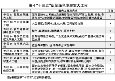 第四,推進國家重大工程建設(shè)。《綱要》專門提出了綠色發(fā)展八類重大工程,共計39個項(見表4)。這是迄今為止中國最大的生態(tài)投資,5年累計額相當(dāng)于“十二五”的兩倍之多,更是未來5年世界最大規(guī)模的綠色投資。這些工程項目具有全局性、基礎(chǔ)性、公益性,既針對我國生態(tài)環(huán)境建設(shè)的薄弱環(huán)節(jié),又是具有帶動性、外溢性的有效投資,是通過物質(zhì)資本、科技資本、人力資本對生態(tài)系統(tǒng)進行生態(tài)投資,起到“前人種樹,后人乘涼”的綠色發(fā)展、綠色投資、綠色就業(yè)、綠色消費、綠色創(chuàng)新的綜合性作用,為下一個五年乃至更長時期的經(jīng)濟社會生態(tài)永續(xù)發(fā)展夯實基礎(chǔ)。