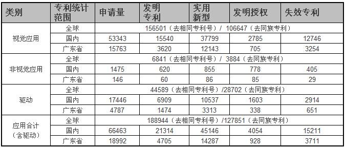 本次檢索基于以上兩個數(shù)據(jù)庫進(jìn)行,其中驅(qū)動部分的數(shù)據(jù)采集時間為2014年1月7日,視覺照明和非視覺照明部分的數(shù)據(jù)采集時間為2014年3月12日。數(shù)據(jù)采集時間范圍是:中國申請專利,1985年1月1日至2013年12月31日;全球申請專利,1960年1月1日至2013年12月31日。LED應(yīng)用技術(shù)申請專利檢索結(jié)果見表1.1。