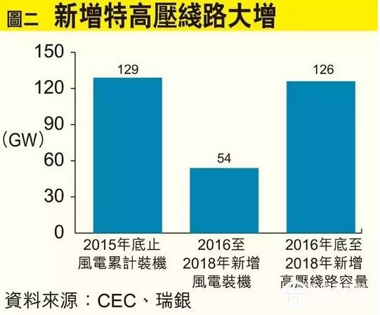 此外,由于特高壓線路可將多余電力,遠距離輸送至電力需求較高的地區(qū),這方面的技術有助改善風電消納。隨著2017年多達10條線路開通,2016至2018年間開始投入營運的線路容量達126GW,與去年底止的全國累計風電裝機總量129GW相距不遠(見圖二)。(功率單位,見「知識庫」——何謂「功率單位」?)