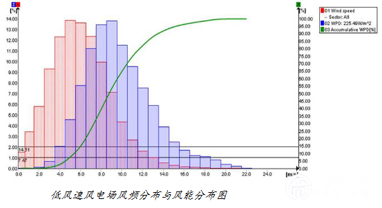 在進入這個問題之前,先來看看下面這幅低風(fēng)速風(fēng)電場風(fēng)頻與風(fēng)能分布圖,你就懂得怎么用好這低風(fēng)速風(fēng)電場的風(fēng)了。請注意,這幅圖可是某5.8m/s的典型低風(fēng)速風(fēng)電場風(fēng)速風(fēng)能分布實例,紅色的分布柱狀圖是風(fēng)速在全年的時間分布,由于風(fēng)能是風(fēng)速的三次方,所以直接給客戶帶來真金白銀的風(fēng)能在全年的分布其實是蘭色的柱狀圖。