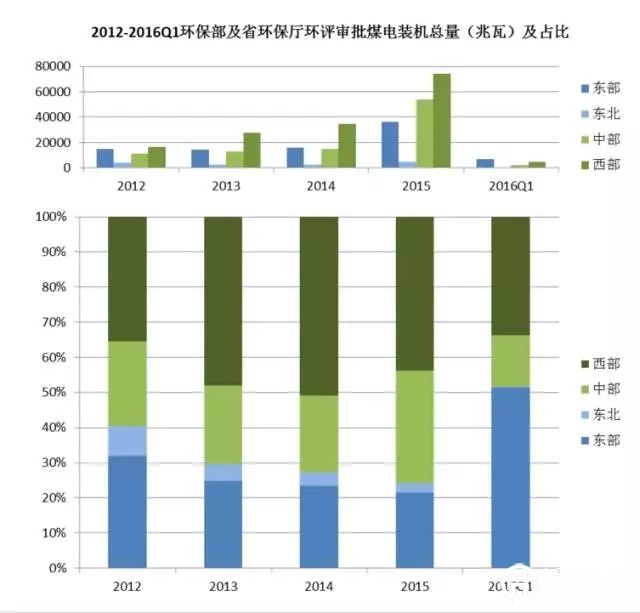 而這樣的結(jié)論背后,是有數(shù)據(jù)支撐的!2012年至2015年,通過環(huán)保部和省環(huán)保廳環(huán)評(píng)審批的中西部燃煤電廠裝機(jī)量占比不斷上升。2015年中西部地區(qū)環(huán)保部及省環(huán)保廳審批燃煤發(fā)電廠裝機(jī)量為128GW,占全國審批煤電裝機(jī)總量的75%。