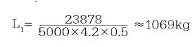 實際運行過程,經(jīng)檢測可生產(chǎn)600t/d的熱水(每天運行20h),溫度由54.4℃提升到59.3℃,溫升為4.9℃,產(chǎn)生熱量12348MJ/d,其中蒸汽壓縮熱力學循環(huán)系統(tǒng)的COP=5.207左右。若水的比熱c=4.2kJ/(kg•K);1kg煤熱量=5000kcal;鍋爐效率=55%。將采用廢熱回收技術(shù)與傳統(tǒng)鍋爐加熱相對比進行核算,則有上述廢熱回收技術(shù)產(chǎn)生的熱量相當于每天需煤量L1為: