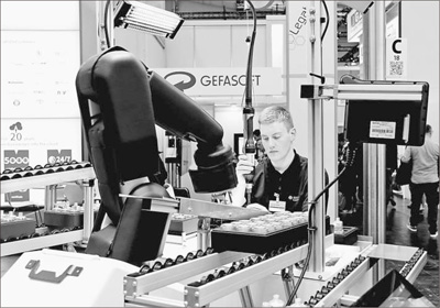 在漢諾威工業(yè)博覽會(huì)上,德國(guó)博世集團(tuán)展示人機(jī)交互生產(chǎn)模式。