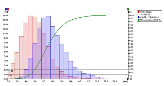 根據(jù)上面功率與風(fēng)速的關(guān)系可知,風(fēng)電場的風(fēng)能量與風(fēng)速的3次方近似呈正比例關(guān)系。如果將該風(fēng)電場風(fēng)頻分布轉(zhuǎn)化為風(fēng)能量分布后(即下圖中藍色柱狀圖),會發(fā)現(xiàn)有兩大秘密隱藏在風(fēng)能量分布圖中: