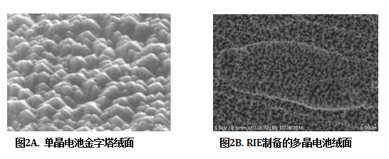 (1)減小入射光反射率:又可分成表面絨面織構(gòu)化和減反射膜兩個(gè)方面。表面絨面織構(gòu)化最典型的應(yīng)用就是堿制絨制備單晶硅電池的金字塔絨面結(jié)構(gòu)。采用選擇性腐蝕NaOH溶液,利用腐蝕液對各個(gè)晶面腐蝕速率的不同,形成非均勻腐蝕,在硅表面形成類似金字塔形狀的絨面,如圖2A。制得絨面的反射率可達(dá)到10%左右。依靠表面金字塔形的絨面結(jié)構(gòu),對光進(jìn)行多次反射,不僅減少了反射損失,而且改變了光在硅中的前進(jìn)方向,延長了光程,增加了光生載流子的產(chǎn)量;曲折的絨面又增加了結(jié)面積,從而增加對光生載流子的收集率。對于多晶硅電池而言,由于硅片晶粒晶向的不均勻,無法使用堿制絨。為有效降低絨面反射率,目前已經(jīng)有反應(yīng)離子刻蝕(RIE)或者濕法納米黑硅技術(shù)應(yīng)用到規(guī)模化生產(chǎn)中。RIE通常使用SF6/O2混合工藝氣體,在蝕刻過程中,F(xiàn)自由基對硅進(jìn)行化學(xué)蝕刻形成可揮發(fā)的SiF,O自由基形成SixOyFz對側(cè)墻進(jìn)行鈍化處理,形成絨面結(jié)構(gòu),如圖2B。其絨面反射率可達(dá)到4%以下。