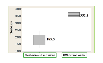 圖9所示的雙面鈍化的少子壽命測試表明,金剛線多晶硅片具有較高的體少子壽命,達(dá)到350us左右,優(yōu)于常規(guī)砂漿線多晶硅片。這樣就從基礎(chǔ)上保證了高效多晶電池的轉(zhuǎn)換效率。