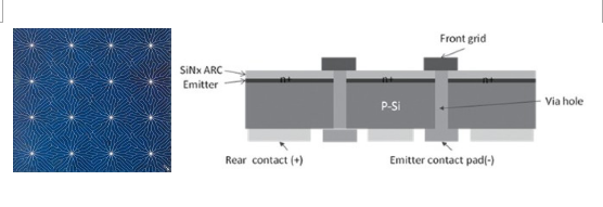 (2)減小正面電極遮光損失:新型正面電極結(jié)構(gòu)例如MWT(MetalWrapThrough)電池,它通過激光穿孔和灌孔印刷技術(shù)將正面發(fā)射極的接觸電極穿過硅片基體引導(dǎo)到硅片背面,通過16個(gè)電極孔收集光生電流,如圖3所示,直接減少了主柵的遮光面積。在MWT電池組件的封裝技術(shù)中,導(dǎo)電膠的采用將背面正負(fù)極同時(shí)與基板連接,這樣增加堆積密度,不僅方便安全,而且也減少FF損失和提高Jsc(分別大約2.5%和1.6%)。
