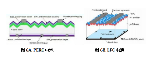 在晶體硅電池背面,目前的鋁背面場可以提供一定的場鈍化效果,但Al作為受主雜質(zhì)在硅材料內(nèi)部的固溶度較低,鋁背場提供的場鈍化效果比較弱。能夠顯著改善背面鈍化效果的是AlOx/SiNx鈍化薄膜,一方面AlOx薄膜內(nèi)部的固定負(fù)電荷密度較高,能夠提供較強(qiáng)的場鈍化能力;另一方面,在高溫?zé)Y(jié)過程中,AlOx與P型硅基片界面能夠形成一層1~2nm厚的SiOx層,起到介質(zhì)鈍化的作用。對于P型基底,AlOx/SiNx疊層薄膜能夠?qū)⑸贁?shù)載流子的表面復(fù)合速率降低到10cm/s。許多高效電池結(jié)構(gòu),如PERC、PERC、PERT、LFC等都是以背面AlOx/SiNx疊層鈍化薄膜為基礎(chǔ)。與常規(guī)晶體硅電池相比,PERC電池用AlOx/SiNx疊層薄膜替代鋁背場,背面鍍完AlOx/SiNx后進(jìn)行局部的激光剝離出硅基片和背面鋁層的接觸窗口,背面的光生電流通過該窗口被背面鋁層收集。目前PERC電池技術(shù)已經(jīng)成為熱門的高效量產(chǎn)技術(shù),其轉(zhuǎn)換效率提升在0.5~0.8個(gè)百分點(diǎn)之間。