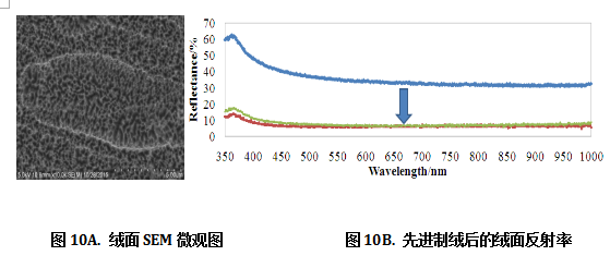 經(jīng)過先進(jìn)制絨技術(shù)手段得到的絨面尺寸在亞微米范圍。從SEM圖片(圖10A)觀察,制絨后的絨面在蟲卵形凹坑內(nèi)部還有許許多多微小的丘陵結(jié)構(gòu),入射光在蟲卵凹坑內(nèi)的微型丘陵結(jié)構(gòu)表面處形成多次反射,從而極大降低制絨后的反射率。和常規(guī)酸制絨相比,其平均反射率能夠降低到10%以下。