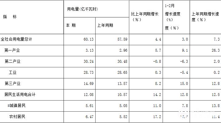 (一)月度電力消費加快增長。3月份,全省全社會用電量21.48億千瓦時,同比增長7.2%,分別比1月份和2月份增速提高4.2和4.3個百分點,比上年同期提高6.4個百分點。其中,工業(yè)用電同比增長10.7%,比1月份、2月份分別提高13.9和18.9個百分點,比上年同期提高25.1個百分點,是推動月度用電量加快增長的主要原因。電力消費作為宏觀經濟運行的現(xiàn)行指標,月度電力消費加快增長預示海南省經濟持續(xù)向好。