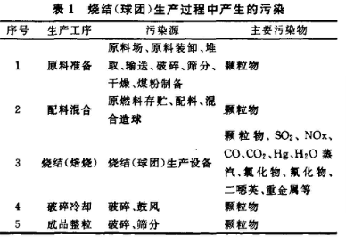 對生態(tài)環(huán)境影響較大和人類健康威脅較大且絕對排放量較大的廢氣主要包括含NOx、SO2、P、AS、PH3、CO、HF、C2HCl3、C2H3Cl3等污染物的有毒氣體及其他煙粉塵等。在燒結(球團)生產過程中所產生的污染見表1。