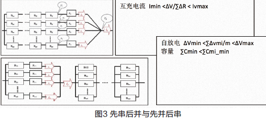 拿先串后并和先并后串來說,就有很大的不同。根據(jù)圖3可以看出,先串后并安全性、可靠性更好;而容量更小、自放電更大,對BMS要求更高。如果采用先并后串則反之。